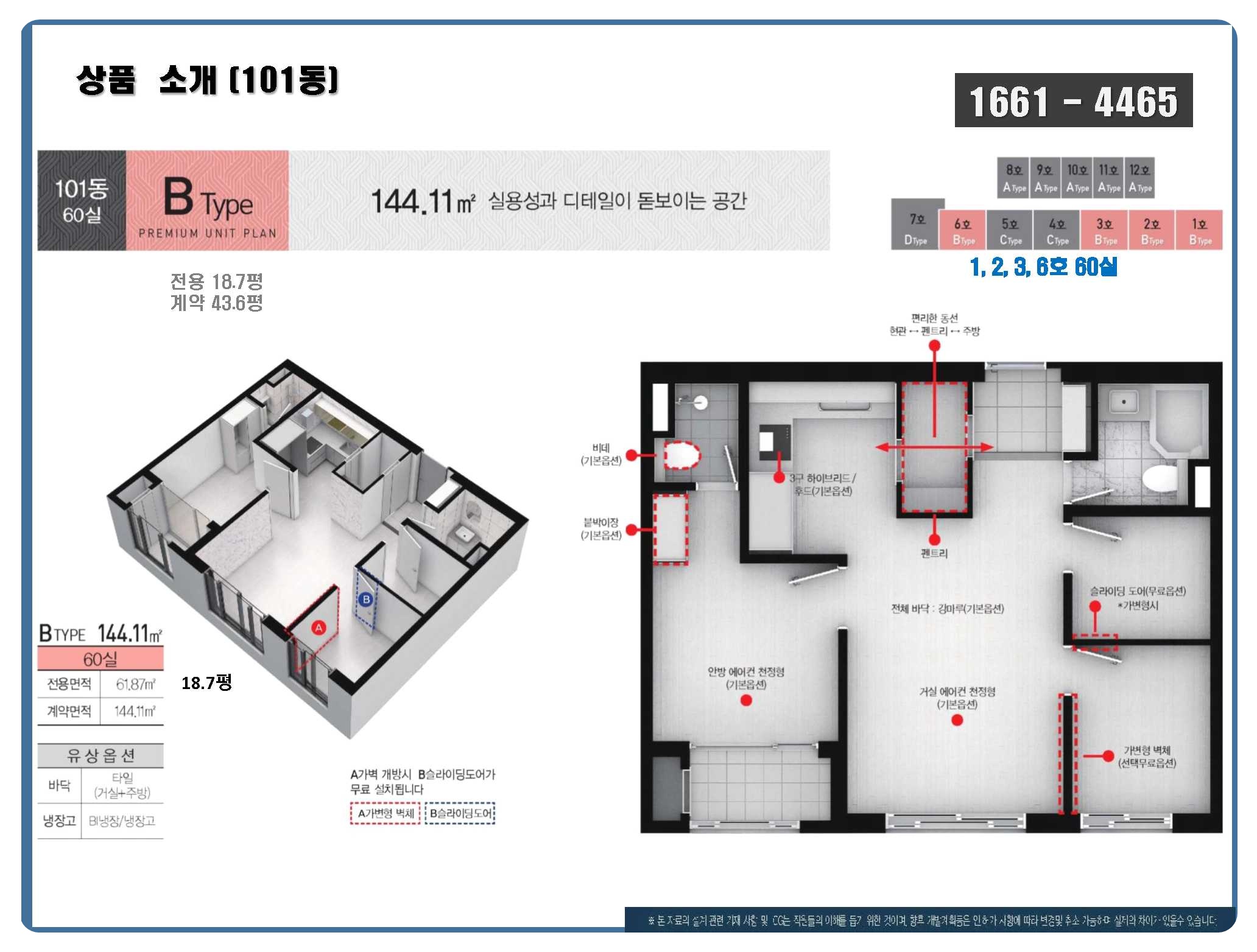 | B | 60실 | 61.87 ㎡ ≈ 18.71평 | 144.11 ㎡ ≈ 43.59평 |