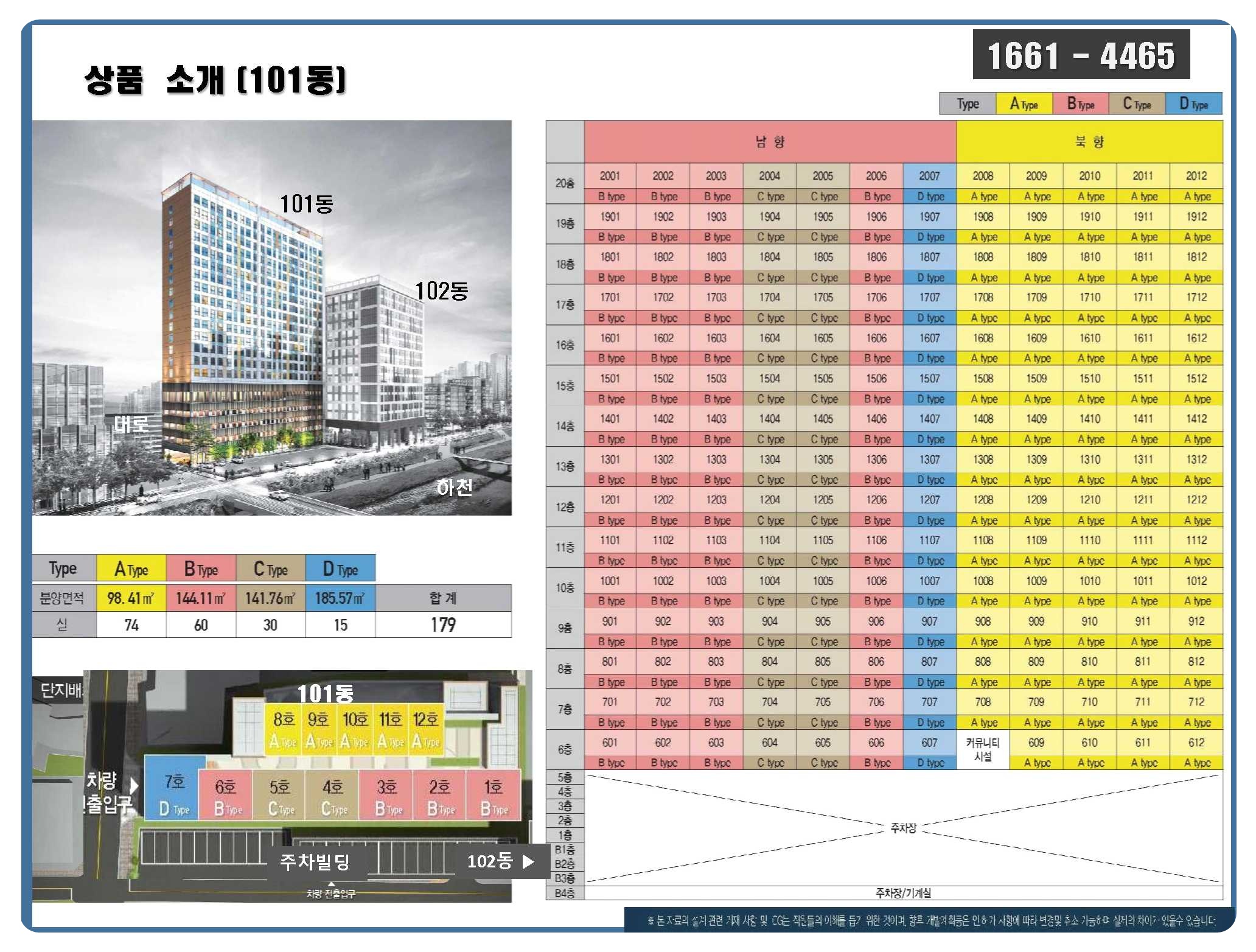 101동 (총 179실): 계약면적 기준 약 98.41㎡, 144.11㎡, 141.76㎡, 185.57㎡ 등 다양한 타입 구성