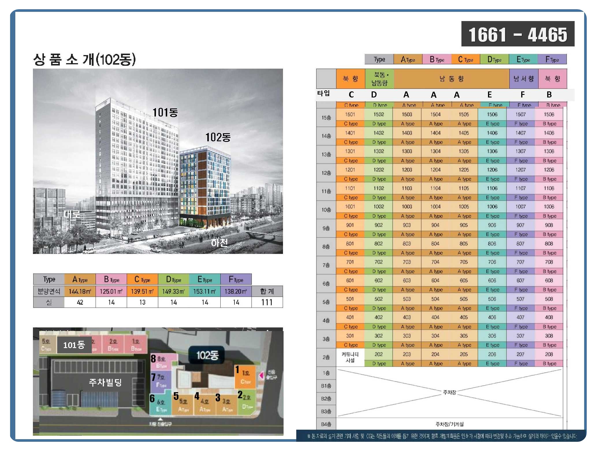 102동 (총 111실): 계약면적 기준 약 **125.60㎡ ~ 153.83㎡**까지 다양한 타입 구성