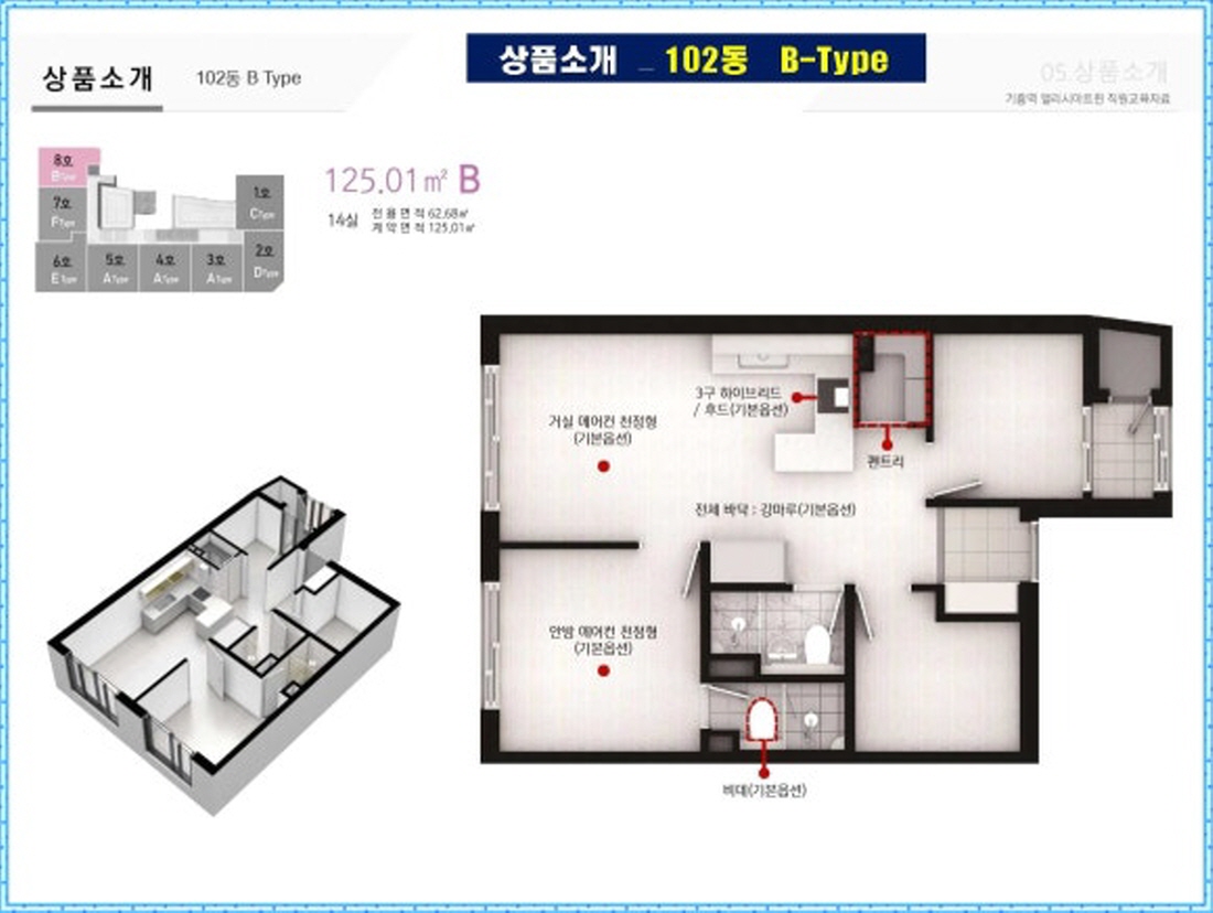 천정형 에어컨, 강마루, 2구 전기쿡탑, 붙박이장, 세탁기, 냉장고/냉동고 등 기본 옵션이 제공